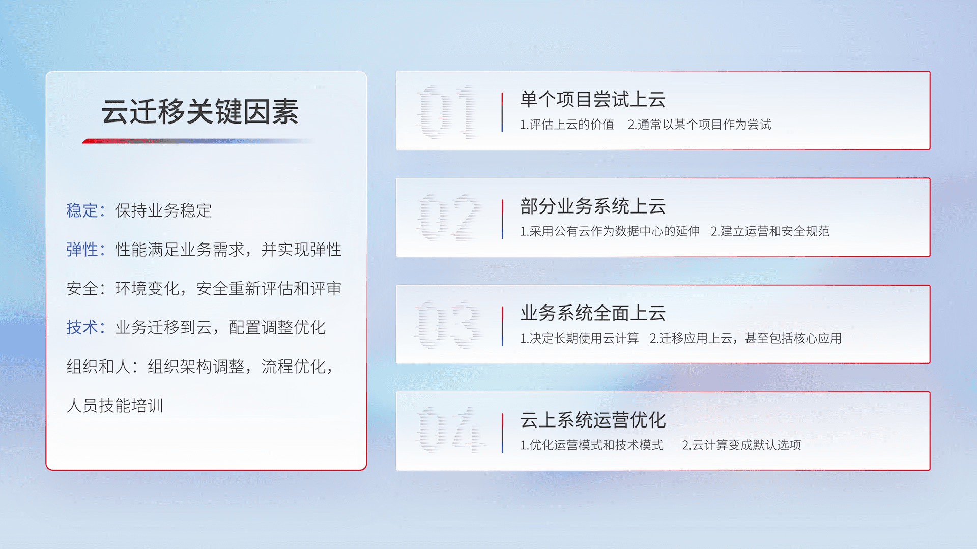 结合实际业务,,,,从规划设计、、、、云平台选型、、、、云原生改造、、、数据迁移、、、、集成交付,,,,迁移全过程为客户识别最佳上云路径,,做好风险识别管理,,设计网络架构、、、、身份权限、、安全审计合规、、操作审计、、日志审计、、监控告警策略、、、多站点容灾设计等,,,对云上基础设施进行整体规划,,,,提升IT治理水平,,,,以满足弹性、、、、高可用、、高性能的需求。。。。