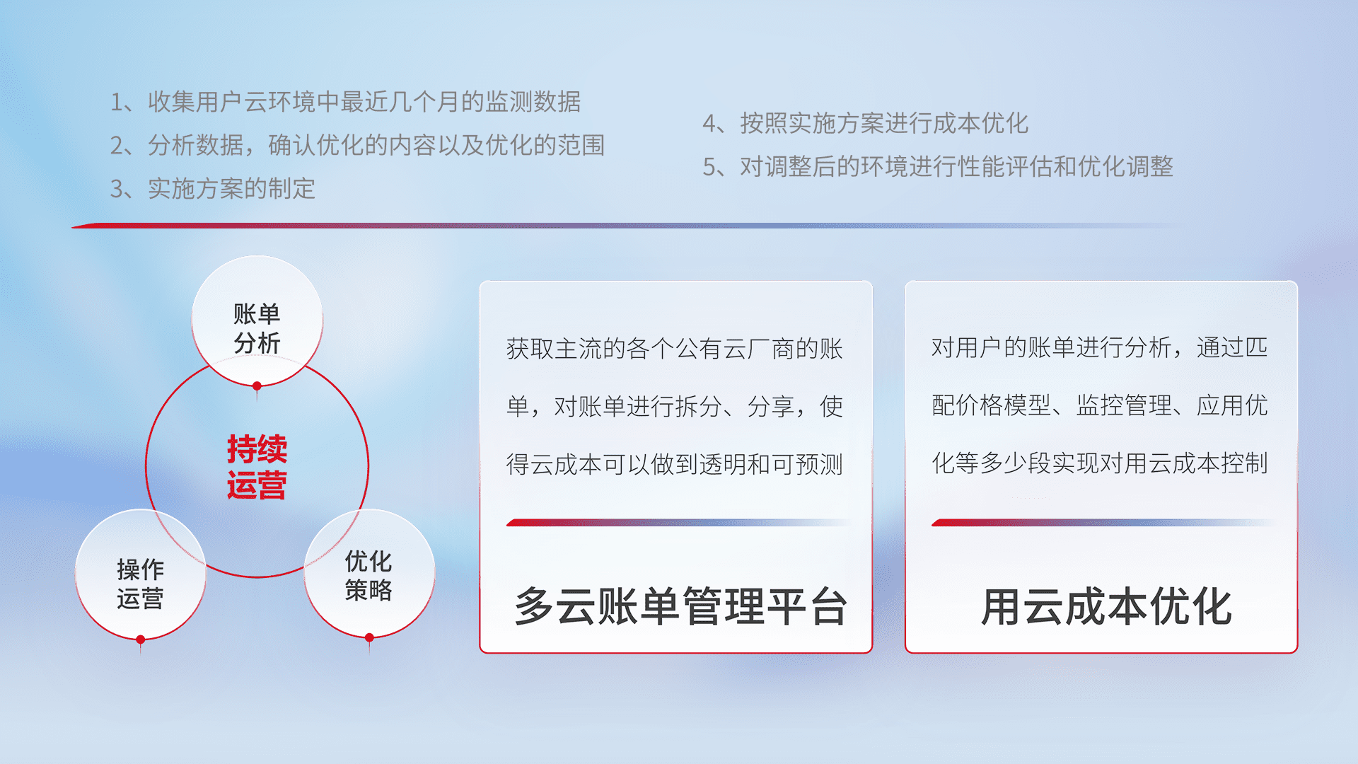 通过多云纳管,,,,以统一的资源数据模型把客户的云资源进行抽象和封装,,进而实现对多云资源的统一操作,,,保障云资源管理的可靠性、、、、稳定性与可用性。。。。量身定制化运维内容,,,,配置、、、、开发运维、、、、补丁管理、、、、备份、、监控、、认证和访问管理、、、审计和日常巡检等,,,保障在用云过程中的可靠度,,稳定度以及高可用率。。